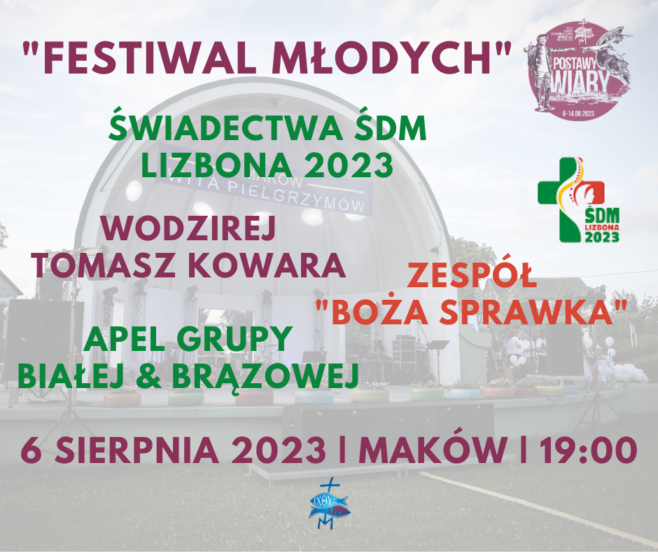 I dzień wędrówki zakończyliśmy niezwykłym koncertem w hali sportowej w Makowie. Zagrali dla Pana i dla nas wyjątkowi muzycy, którzy jak sami o sobie mówią: „Grają na co dzień i od święta, a wszystko, co robią, to po prostu Boża spRawka”. Przygotowali dla nas modlitwę uwielbienia śpiewem, opartą na przesłaniach wszystkich Światowych Dni Młodzieży. Swoją cegiełkę do tego wieczoru dołożyli także młodzi z diecezji łowickiej, którzy aktualnie przebywają w Lizbonie, ale pamiętają o nas w modlitwie i obiecują zawitać na szlak. Dziękujemy także Tomkowi Kowarze – naszemu Przyjacielowi, wodzirejowi i człowiekowi o otwartym sercu, który podzielił się świadectwem uczestniczenia w ŚDM Lizbona 2023.